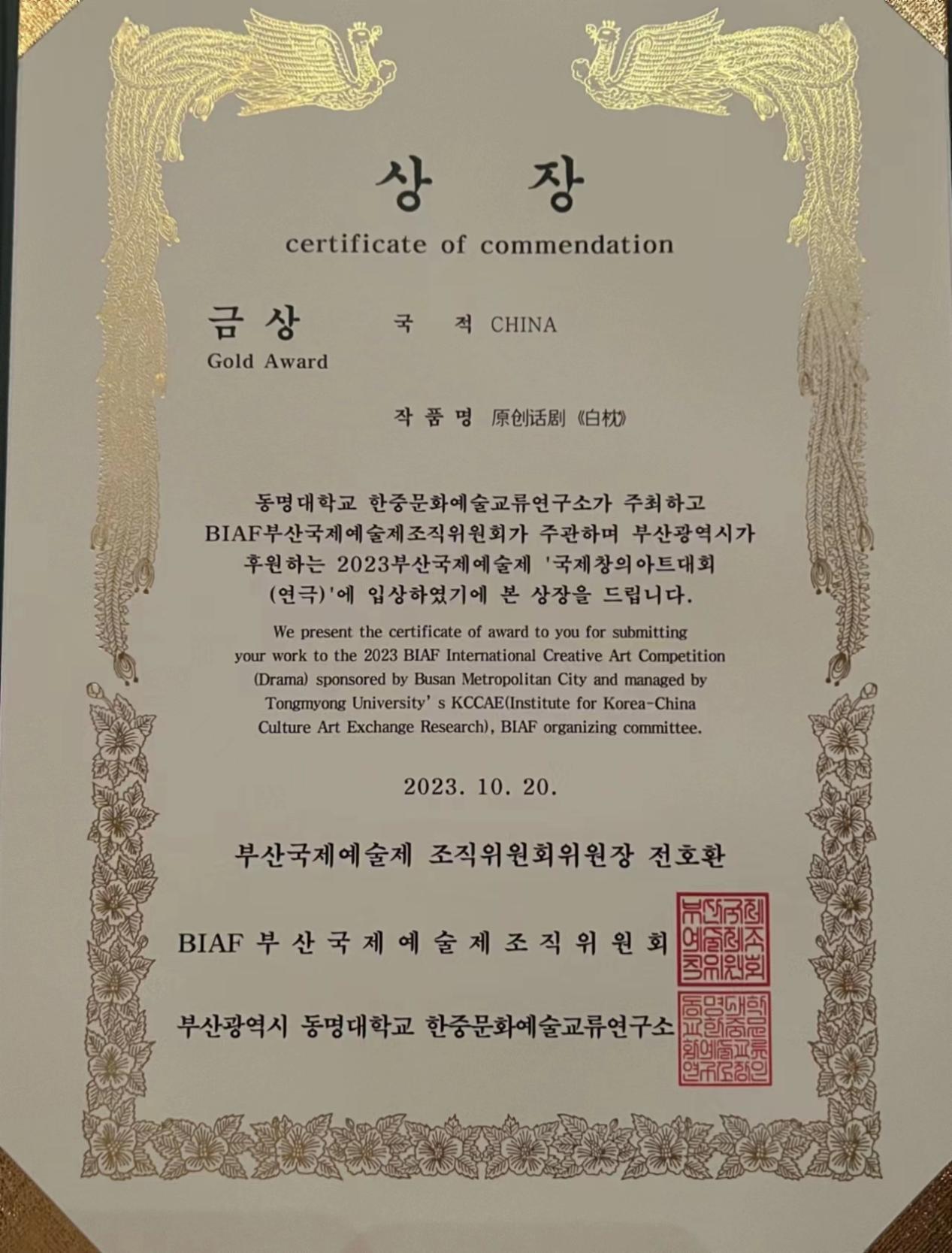 近日,第61届BIAF釜山国际艺术节在韩国釜山开幕,sunbet申搏表演学部首届启泰表演定制班原创话剧《白枕》继在2023棱镜MINI戏剧节中获奖后,又于BIAF釜山国际艺术节颁奖典礼中斩获话剧单元国际金奖。