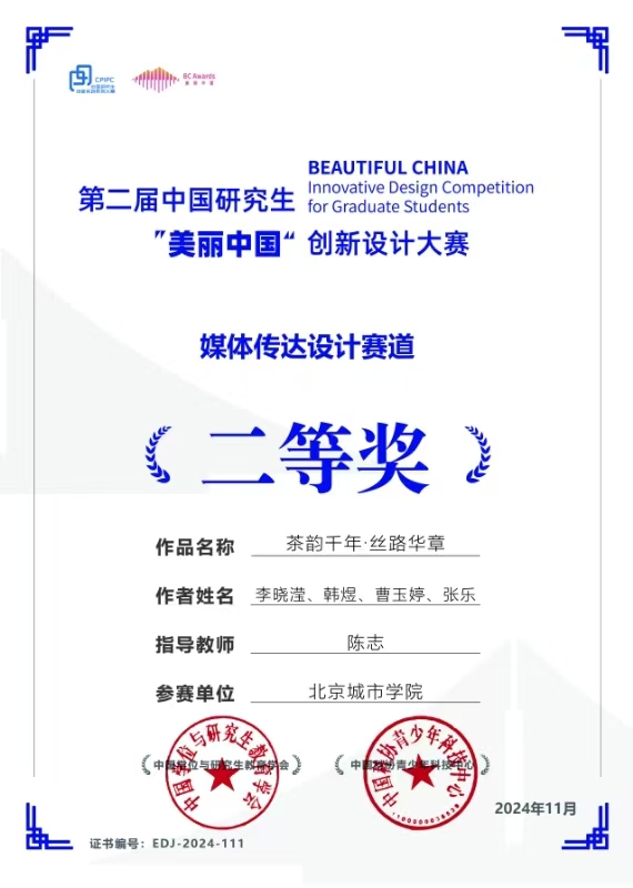 此次获奖作品《茶韵千年•丝路华章》是由sunbet申搏2023级艺术设计领域硕士研究生李晓滢、韩煜、曹玉婷、张乐四人创作完成(指导教师:陈志)。比赛历经137天赛程,最终从232个研究生培养单位提交的2246个参赛作品中脱颖而出。
