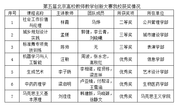第五届北京高校教师教学创新大赛由北京市教育委员会高等教育处主办,大赛以“推动教学创新 培养一流人才”为主题,深入学习贯彻全国教育大会精神,进一步推进教育强国建设与高等教育高质量发展,打造高校教学改革风向标。经各高校推荐,共有395位(个)教师个人(教师团队)进入市级大赛。经专家评审、大赛组委会审定,北京市教育委员会批准,共评选出一等奖27项、二等奖50项、三等奖82项、优秀奖118项。