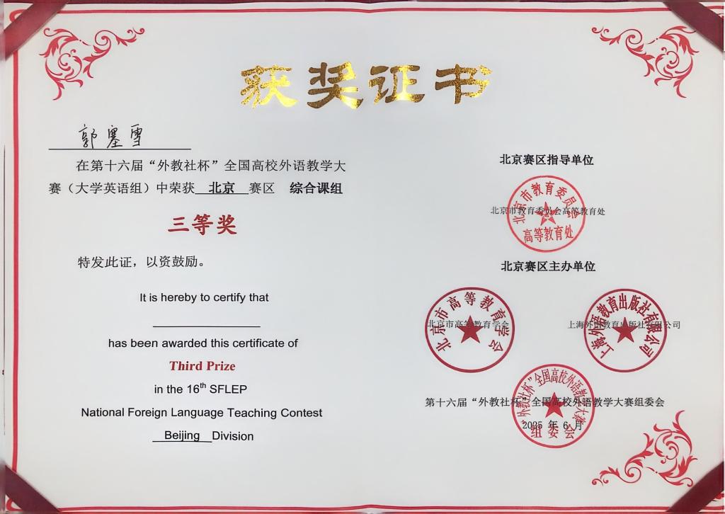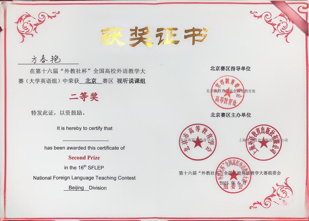 6月8日,第十六届“外教社杯”全国高校外语教学大赛(大学英语组)北京赛区决赛暨颁奖典礼在北京交通大学举行,sunbet申搏公共英语教研室教师方春艳荣获视听说课组二等奖,郭塞雪荣获综合课组三等奖。