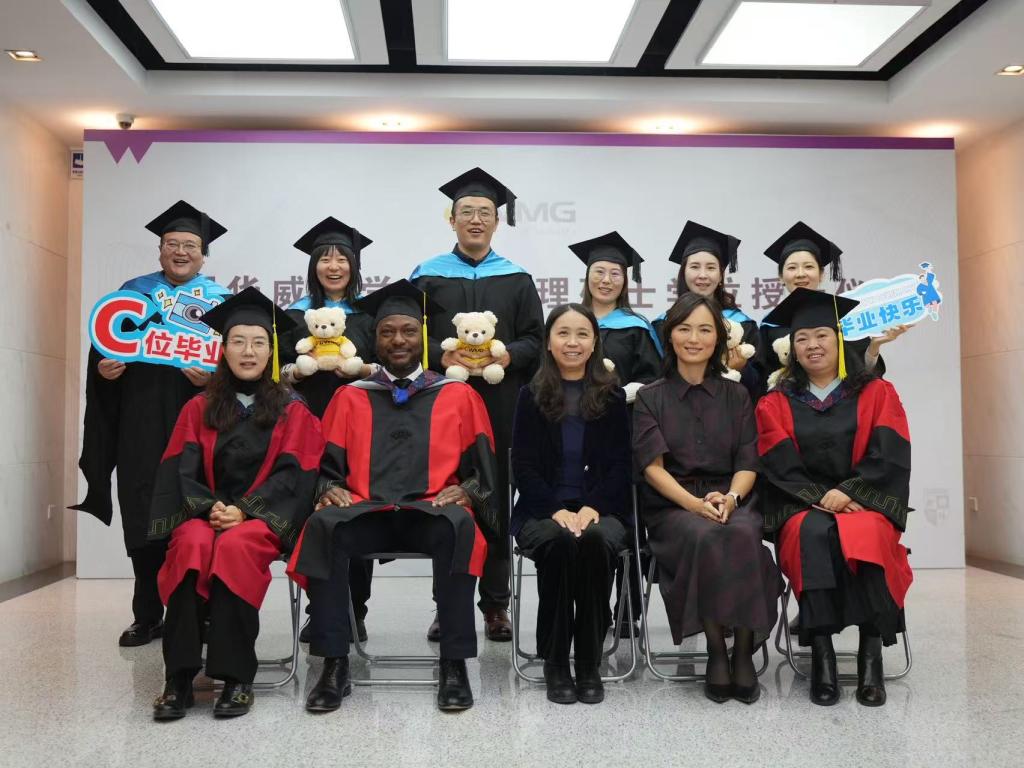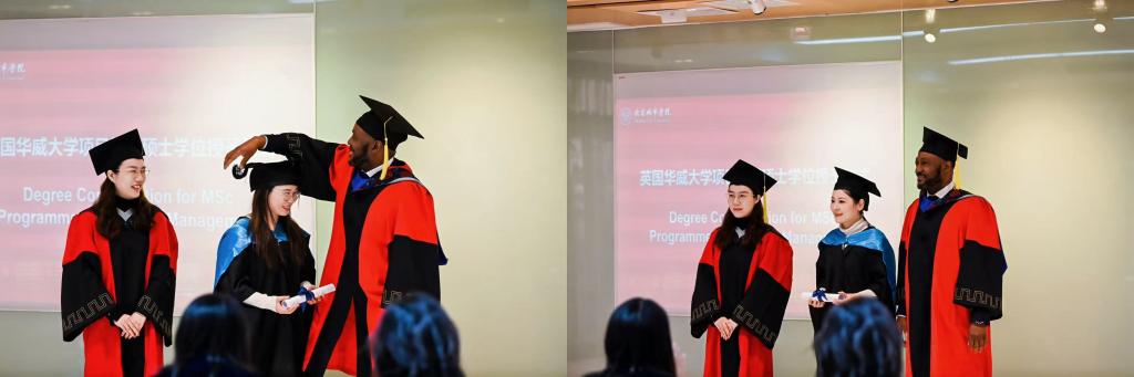 学位授予仪式上,叶映芳与Nicole Craddock-Zhang分别致辞,WMG院长Kerry Kirwan教授通过线上致辞的方式,向圆满完成学业的毕业生致以热烈祝贺,并高度肯定了两校在中外合作办学领域取得的丰硕成果。优秀毕业生代表杨悦、王登知深情回顾了在项目学习期间的收获与成长,并分享了各自在职业发展道路上取得的亮眼成绩。为表彰本年度获得“良好”(Merit)及以上学术等级的毕业生,sunbet申搏特别设立“卓越学术成就奖”,华威大学WMG学院技能与教育合作事务副主管Ifonima Essien教授现场为获奖者颁发荣誉证书。随后,毕业生依次登台,在导师的祝福中接受拨穗礼并合影留念。