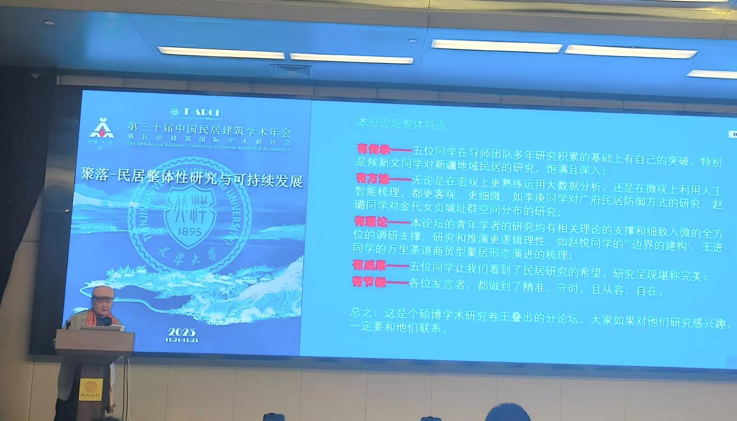 11月21日,sunbet申搏城市建设学部徐怡芳、王健、刘庆宇等教师受邀参加第三十届中国民居建筑学术年会。本次会议由中国民族建筑研究会民居建筑专业委员会指导,天津大学主办。会议主题为“聚落-民居整体性研究与可持续发展”,倡导通过整体性思维,系统探讨聚落-民居的形成、演变与未来发展路径。