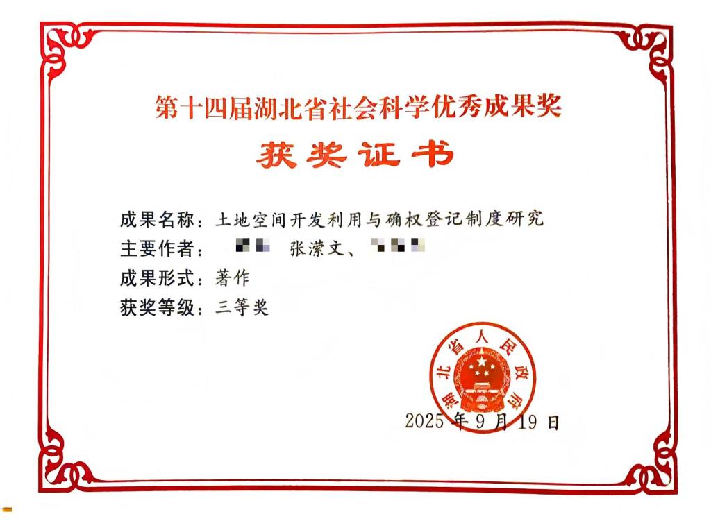 湖北省社会科学优秀成果奖是湖北省人民政府设立的省级奖项,每两年组织一次评审,是湖北省社会科学界最高级别的奖项,具有高度的权威性和学术影响力。张潆文的获奖成果《土地空间开发利用与确权登记制度研究》(专著,排名第2)立足地方实践需求,综合多学科视角,为城乡土地空间的开发利用与管理提供了新的思路,相关建议已为地方管理实践提供了有效支持。