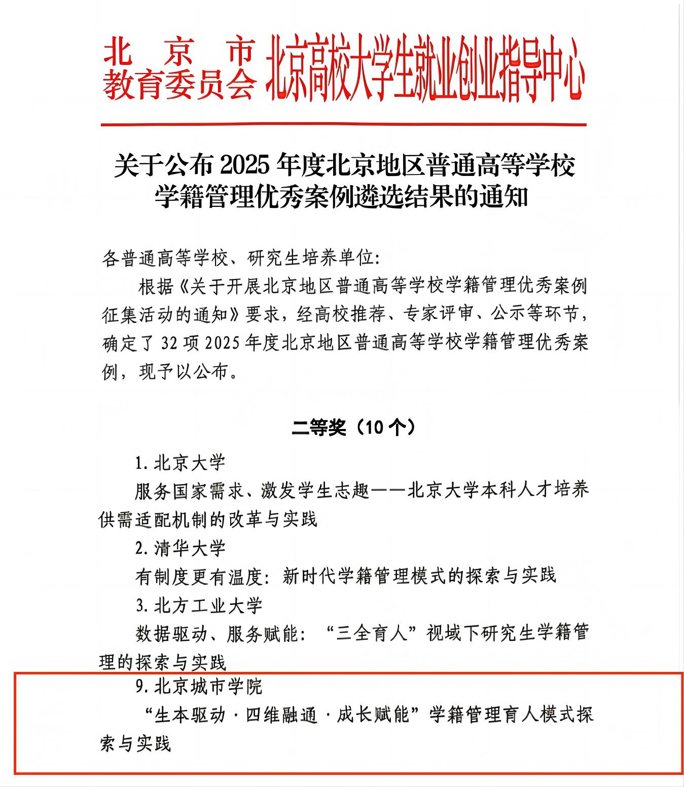 近日,2025年度北京地区普通高等学校学籍管理优秀案例遴选结果正式公布,sunbet申搏报送的“生本驱动·四维融通·成长赋能”学籍管理育人模式探索与实践的学籍管理案例凭借规范的流程体系、创新的服务举措及显著的实践成效荣获二等奖,充分彰显了学校在学籍管理工作中的专业化水平与育人温度。