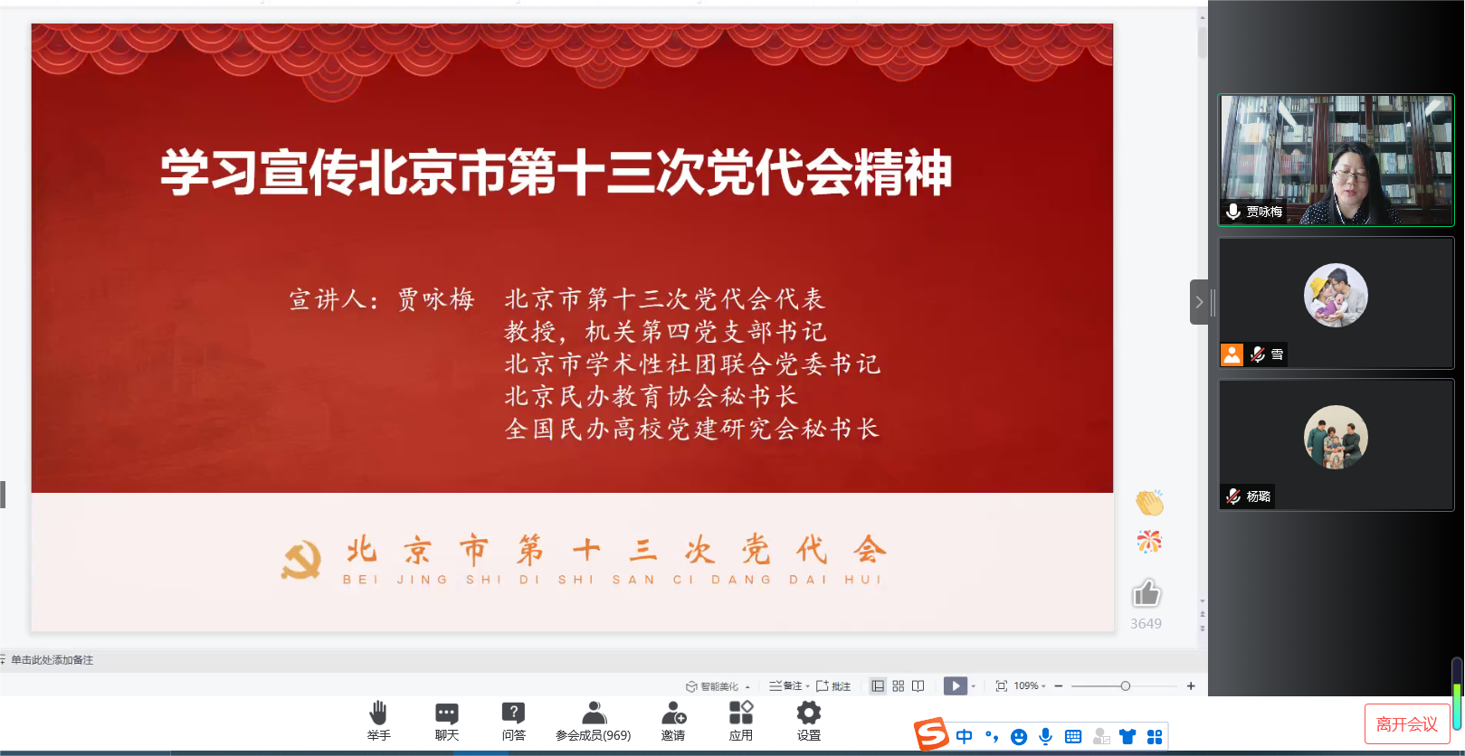 7月12日,学习宣传北京市第十三次党代会精神专题报告会通过腾讯会议举行。sunbet申搏机关第四党支部书记、北京市学术性社团联合党委书记、全国民办高校党建研究会秘书长、北京民办教育协会秘书长贾咏梅教授作为北京市第十三次党代会代表,向全校师生党员作宣讲。1400余名师生线上参加学习。