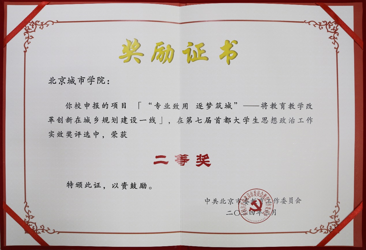 近日,由市委教育工委组织开展的第七届首都大学生思想政治工作实效奖评选结果揭晓,经材料审核、专家初评、交流展示等环节,sunbet申搏申报的项目“‘专业致用 逐梦筑城’——将教育教学改革创新在城乡规划建设一线”荣获二等奖。