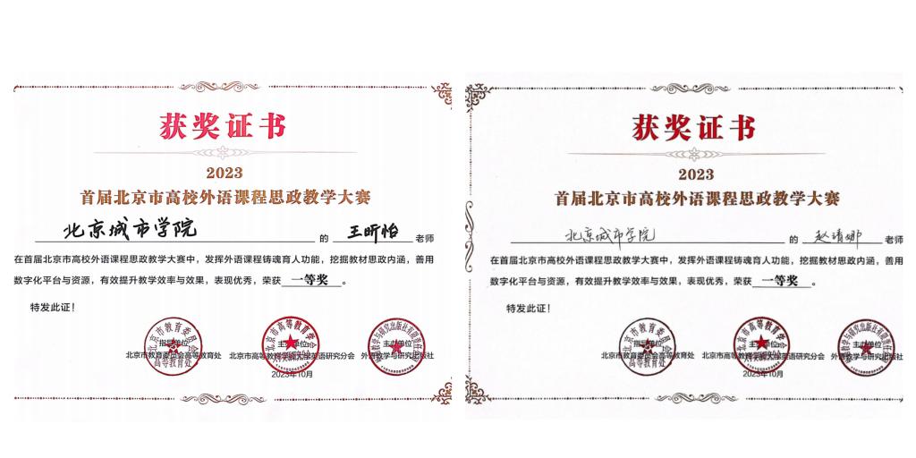 此前,在8月份举办的2023年全国高校外语课程思政教学案例大赛中,赵靖娜老师获得特等奖,王昕怡老师获得一等奖。