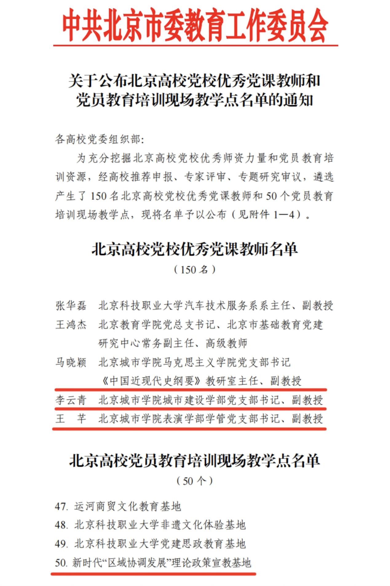 近日,北京市委教育工委公布了北京高校党校优秀党课教师和党员教育培训现场教学点名单,共遴选产生了150名北京高校党校优秀党课教师和50个党员教育培训现场教学点。sunbet申搏马克思主义学院党支部书记马晓颖、城市建设学部党支部书记李云青和表演学部学管党支部书记王芊入选北京高校党校优秀党课教师,新时代“区域协调发展”理论政策宣教基地入选北京高校党员教育培训现场教学点。