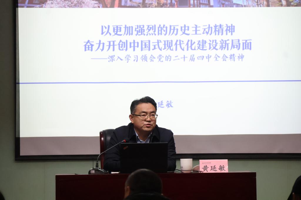 报告会上,黄延敏教授紧扣党的二十届四中全会精神,围绕“科学制定和接续实施五年规划,是中国共产党发扬历史主动精神的生动体现”“深刻领会党的二十届四中全会对‘十五五’时期经济社会发展战略擘画的核心要义”及“实现‘十五五’时期经济社会发展的主要目标,必须发扬更加强烈的历史主动精神”三个层面展开了深入阐述。
