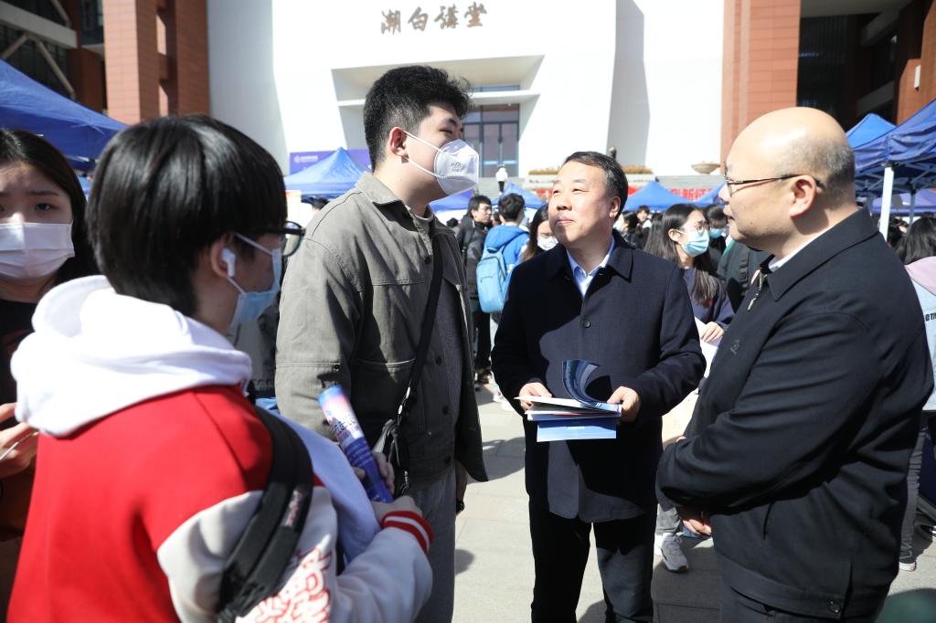 当天,活动由“建功新时代 就业向未来”2023届毕业生春季校园双选会拉开序幕。北京中外建工程管理有限公司、中国光大银行股份有限公司、中国科学院幼儿园、小米集团等国企、民企共计179家用人单位参与,提供岗位846个,涵盖教育、医药、信息技术、建筑工程、金融、艺术等多个领域,数千名毕业生踊跃参与本次双选会。吴晓军和刘林与用人单位、求职学生亲切交谈,了解用人单位需求和毕业生求职情况。