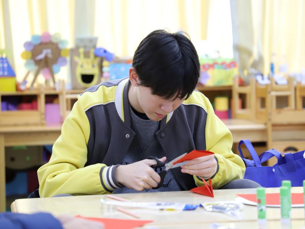 (学生在教育学部参与“巧手慧心 妙剪生花”学前教育环境创设活动)