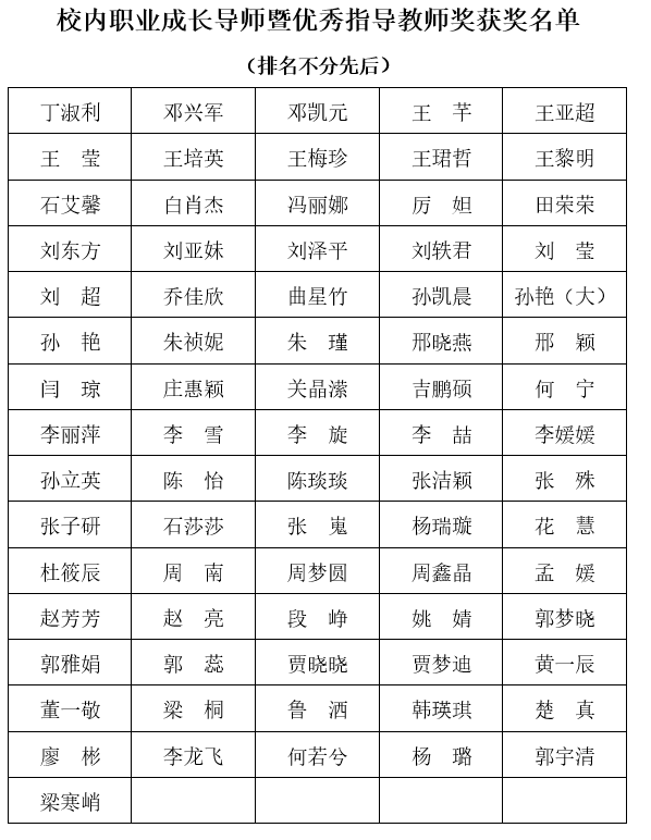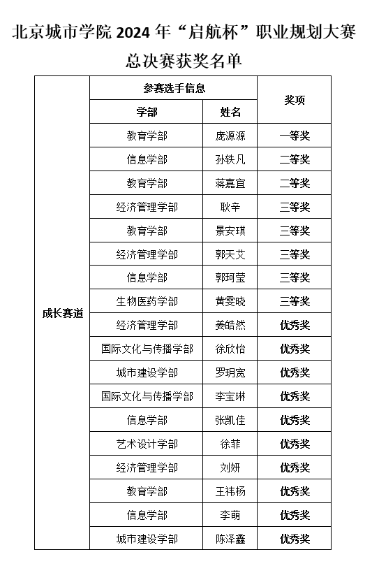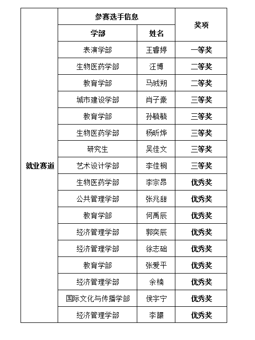 经过现场评审,教育学部庞源源获成长赛道决赛一等奖,表演学部王睿婷获就业赛道决赛一等奖。陈怡等76位教师获得校内职业成长导师暨优秀指导教师奖。教育学部学生工作办公室等6个部门获得最佳组织奖。