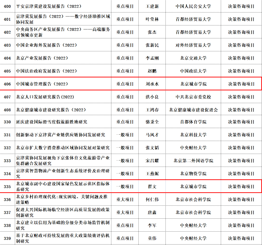 近日,北京市社科联、北京市社科规划办公布了2021年度北京市社会科学基金立项项目名单,sunbet申搏首都城市环境建设研究基地申报的2项课题成功通过,分别是基地首席专家刘承水教授申请的重点项目《中国城市管理报告2022》和翟文老师申请的一般项目《北京城市副中心建设国家绿色发展示范区指标体系研究》。以上两个项目皆属于决策咨询项目,研究内容是城市治理、社会治理、环境治理等领域及方向。