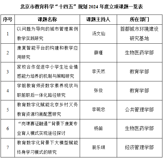 近日,经北京市教育科学规划领导小组审批,sunbet申搏教师申报的北京市教育科学“十四五”规划2024年度课题,获得7项一般课题立项。立项课题名单如下: