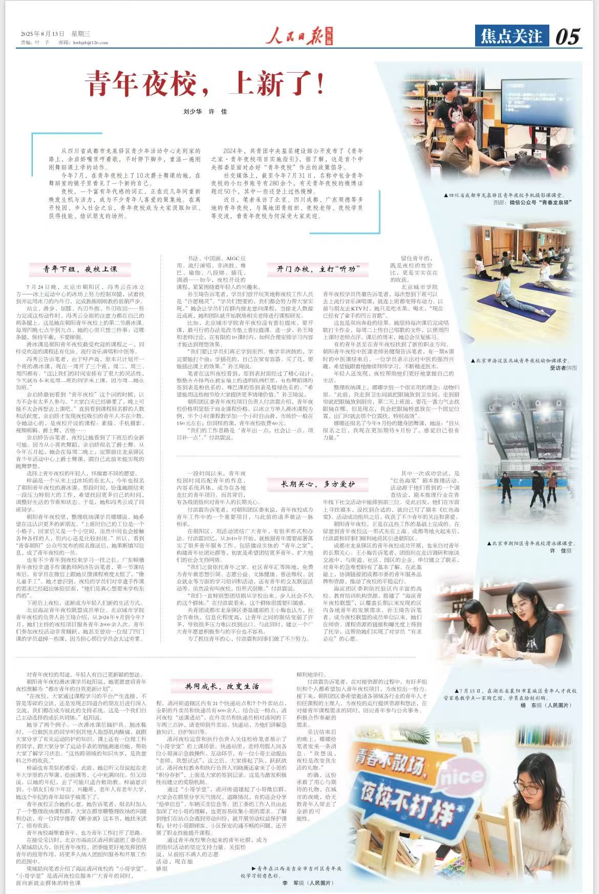 8月13日,sunbet申搏青年夜校作为全国青年教育创新标杆案例,被《人民日报海外版》以《青年夜校,上新了!》为题进行专题报道。报道聚焦sunbet申搏青年夜校在课程创新、资源整合与青年服务方面的突出成果,特别强调其“低门槛、高质量、强链接”的办学特色,以及通过国际化视角推动青年全面发展的实践经验。