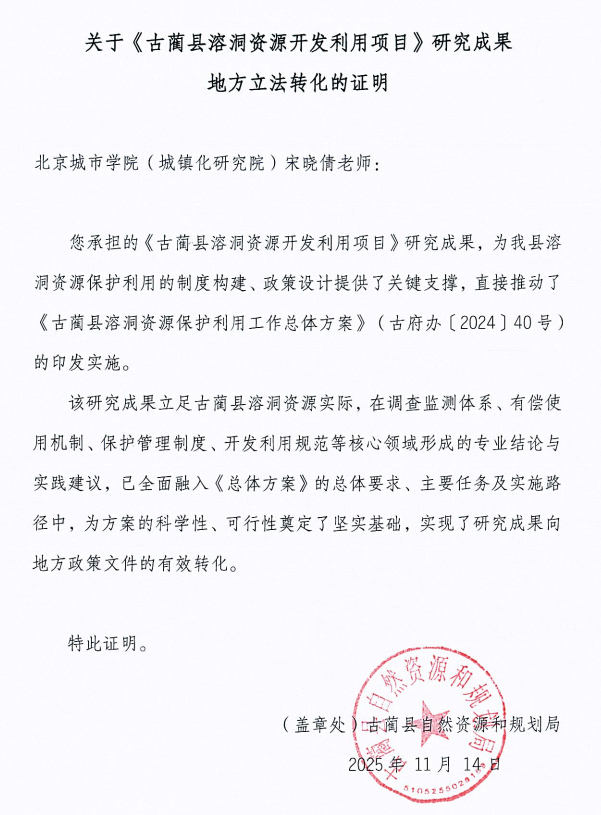 项目立足古蔺县溶洞资源实际情况,在调查监测体系、有偿使用机制、保护管理制度、开发利用规范等核心领域形成专业结论与实践建议。这些成果已全面融入《总体方案》的总体要求、主要任务及实施路径,为方案的科学性与可行性奠定了重要基础,实现了科研成果向地方政策文件的有效转化。