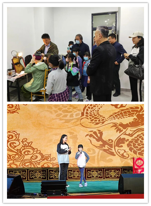 演出前,刘林校长、刘侗院长带领少年宫的孩子们到后台了解了京剧演员演出前的幕后工作。看到正在化妆的演员,孩子们兴奋不已。少年宫的小朋友还上台即兴表演了京剧唱段,稚嫩的童声、一板一眼的招式引来观众热烈的掌声。