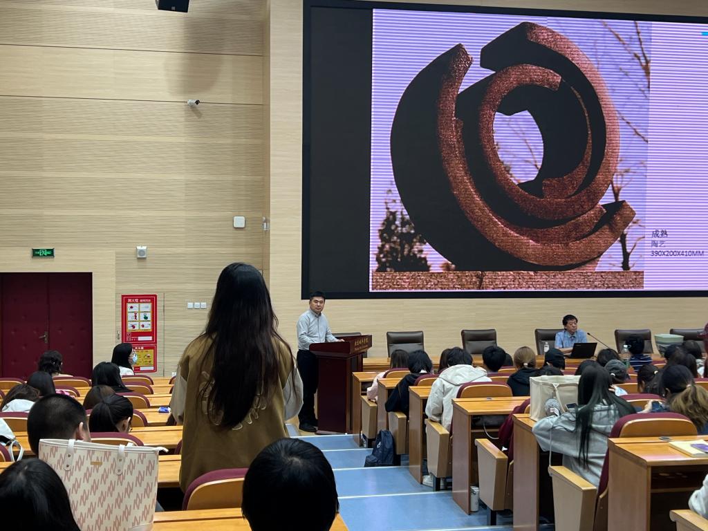 讲座中,陈烈汉大师以其深厚的学术造诣与卓越的艺术成就,将个人的艺术探索之旅娓娓道来。他深刻剖析了传统陶瓷与现代设计之间的精妙融合,揭示了工艺技术与艺术灵感如何在新时代碰撞出创新的火花,并通过一系列精心挑选的作品展示,生动展现了他在陶瓷艺术领域中的题材创新、造型突破、材料探索及工艺革新,为在场的师生开启了一扇通往艺术鉴赏新高度的窗口。
