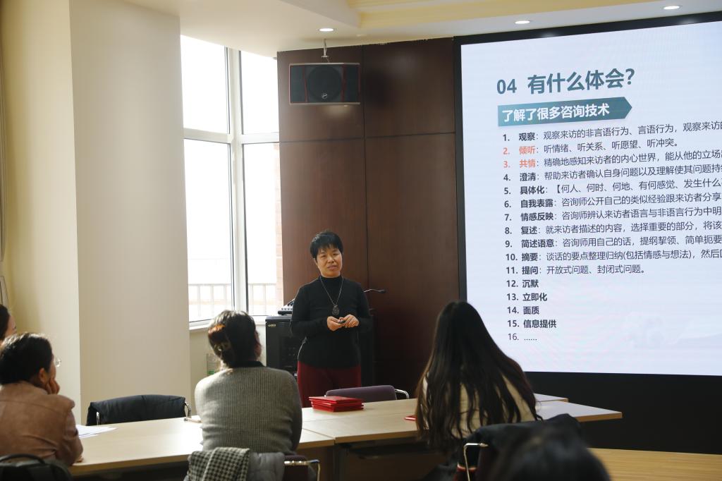 在分享与交流环节,质保处刘雪梅老师结合自身学习经历,分享了参与心理培训的收获与体会。她提到,通过线上线下学习、实习实践,深入了解了多种咨询流派和技术,尤其对“倾听”与“共情”有了更深的理解,这些技能在实际工作中发挥了巨大作用。