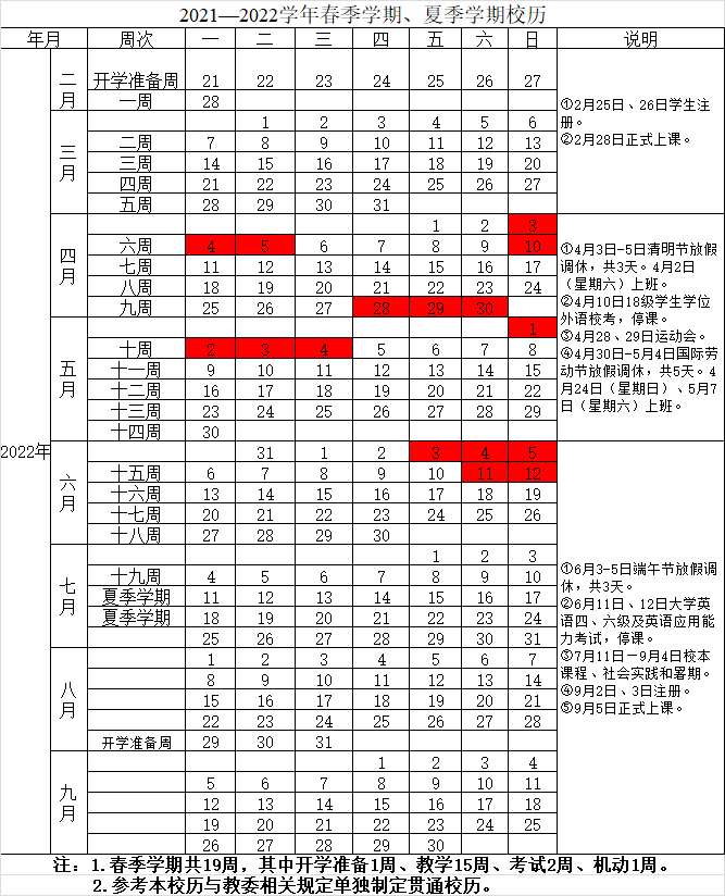 2021—2022学年春季学期、夏季学期校历