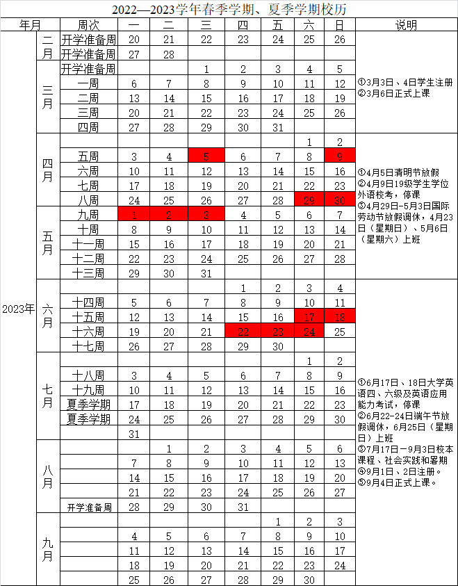 2022—2023学年春季学期、夏季学期校历