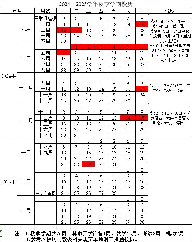 2024—2025学年秋季学期校历