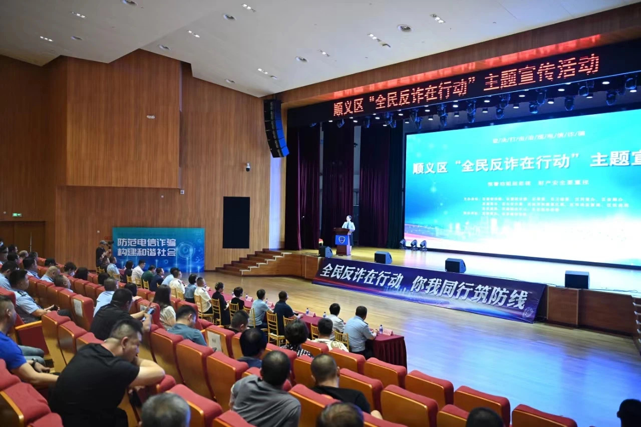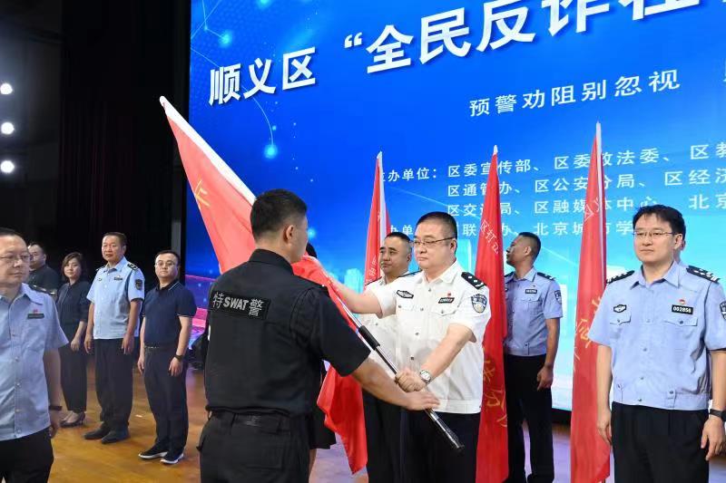活动中,全体与会人员观看电信网络诈骗十大高发类案介绍和顺义区反诈宣传短剧《破诈》。顺义区副区长、公安分局党委书记、局长杨大胜为区级专业反诈宣传队和9家专业反诈宣传分队进行授旗,并发布全民反诈动员令。