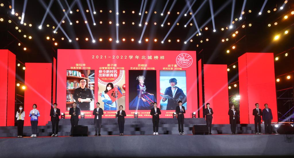 党委书记龚裕、党委副书记叶映芳、副校长胡丽琴为2021-2022学年北城榜样代表颁奖。在学科竞赛、志愿服务、冬奥保障等方面获得突出成绩的学生代表受到表彰,为新生的大学启航提供榜样示范。
