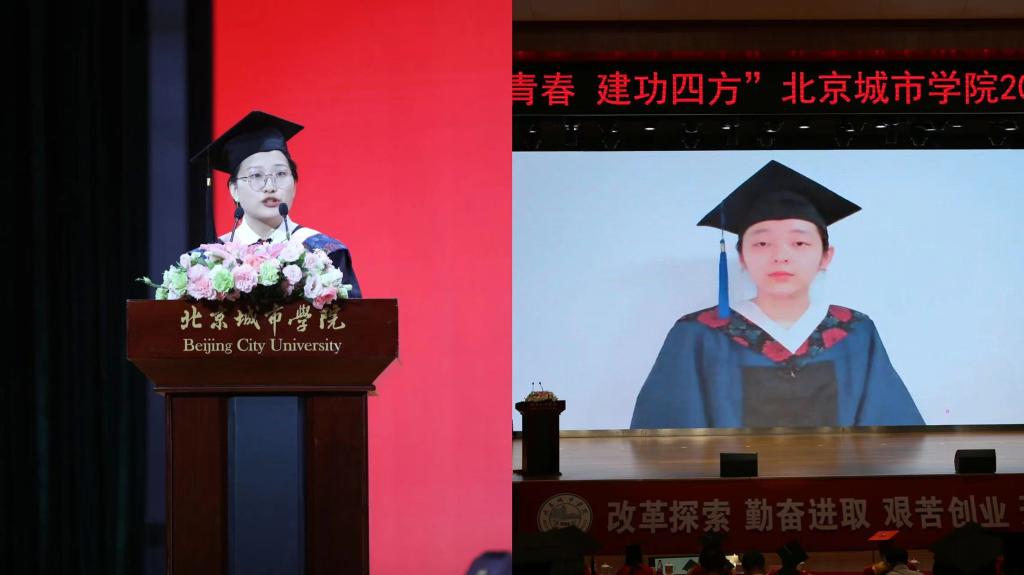 毕业生代表王俊杰、谢林辰依次发言,分别讲述了自己在校期间的成长历程,表达了对母校的感激和不舍之情,并表示将牢记北城校训和师长嘱托,高扬理想风帆,投身强国伟业,披荆斩棘,奋力奔跑,不负时代,不负韶华,用青春继续谱写新的百年华章。