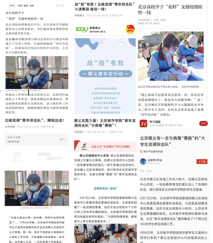 近日,校团委就近就便组织流调”青年突击队“,支援顺义区疾控中心开展大数据流调溯源工作,为打赢这场疫情防控阻击战贡献青春力量。中国青年报、北京日报、顺义时讯、顺义电视台等多家媒体对这一事迹进行了深入报道。