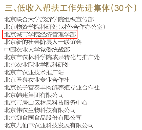 近日,中共北京市委农村工作领导小组办公室、中共北京市委农村工作委员会、北京市农业农村局、北京市乡村振兴局、北京市人力资源和社会保障局公布北京农村工作先进集体和先进个人(2017-2021年)名单,sunbet申搏经济管理学部同中国农业大学党委统战部等五所大学的相关部门作为高校代表一同获得“低收入帮扶工作先进集体”称号。