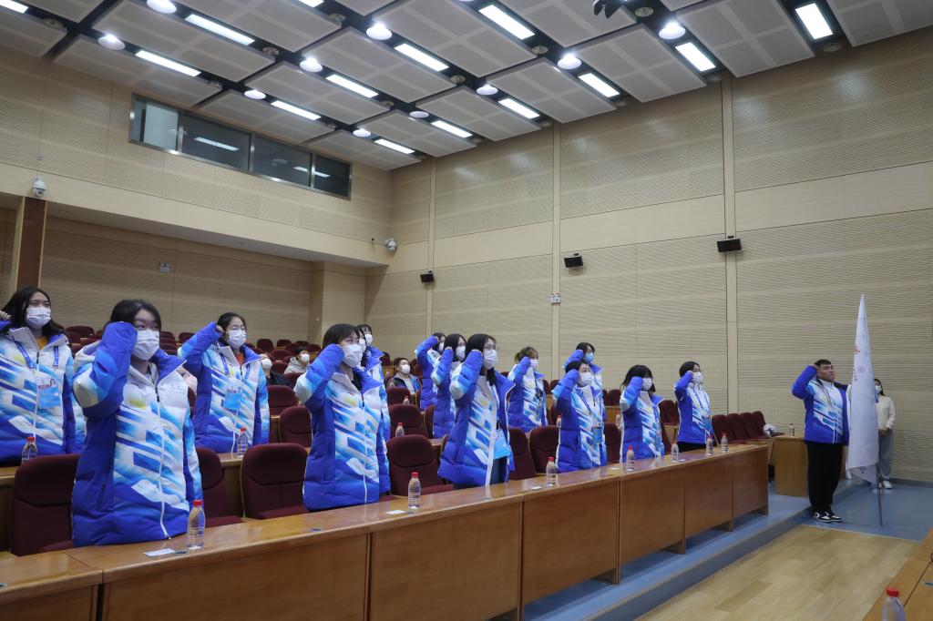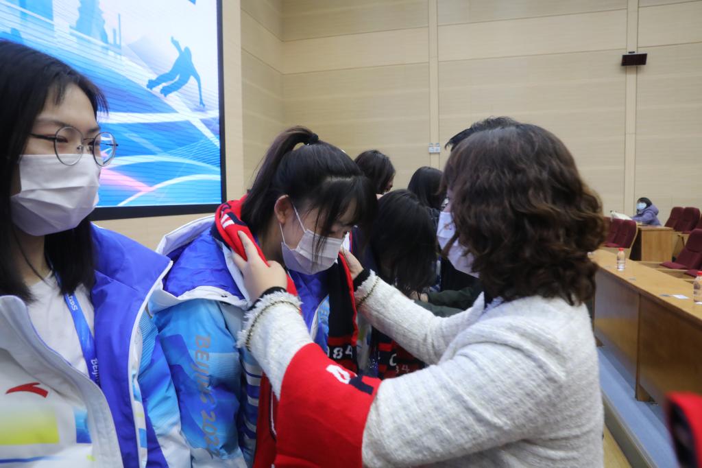 学工委书记杨培玉为出征冬奥志愿者服务队授旗。随后,志愿者们集体宣誓:将共同践行“奉献、友爱、互助、进步”的志愿服务理念,认真落实冬奥会志愿服务工作的标准要求,以优质的服务向世界展示北城学子的责任担当和时代风采。