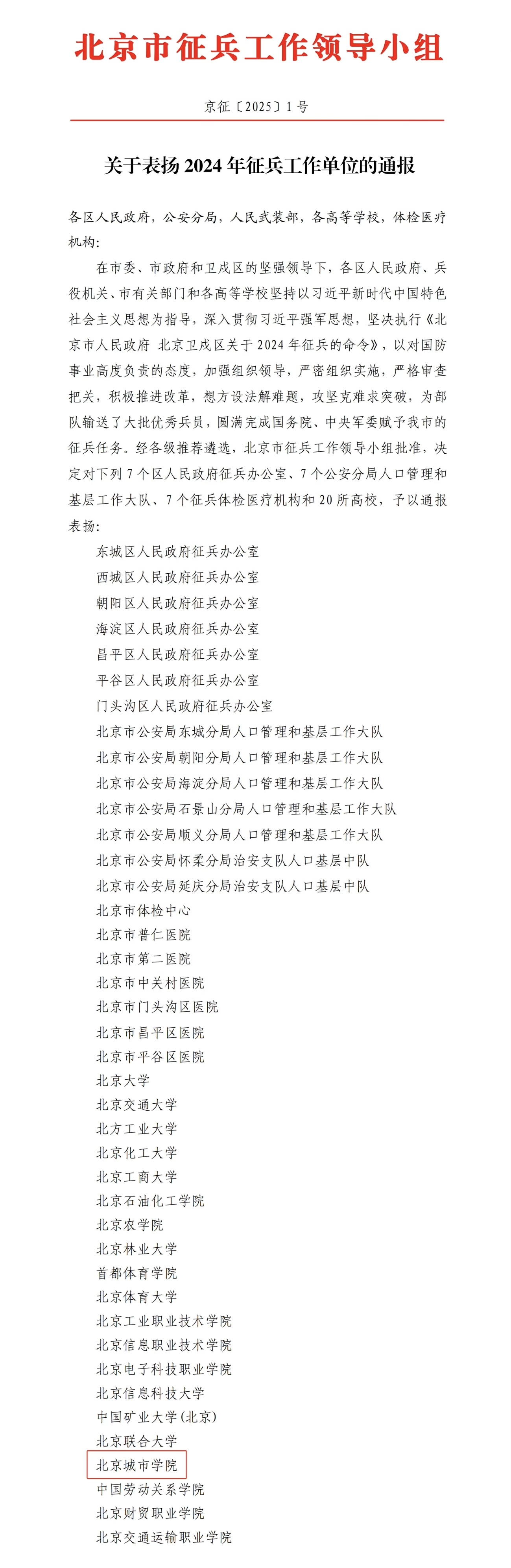 本次共有7个区人民政府征兵办公室、7个公安分局人口管理和京征〔2025〕1号北京市征兵工作领导小组基层工作大队、7个征兵体检医疗机构以及20所高校获得通报表扬。此次获得的荣誉是对学校长期重视国防教育,扎实推进征兵工作,圆满完成征兵任务的高度认可。