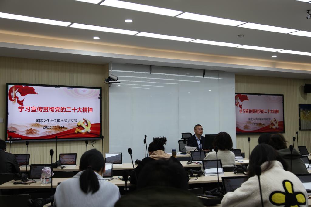 11月4日,国际文化与传播学部党支部在教一楼308组织全体党员和入党积极分子开展学习宣传贯彻党的二十大精神专题活动。本次活动还邀请了非党员的教研室(专业)主任、民主党派教师及参加本学期课程思政大赛的教师。