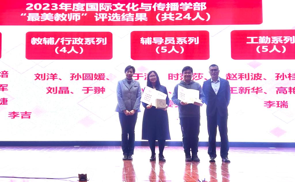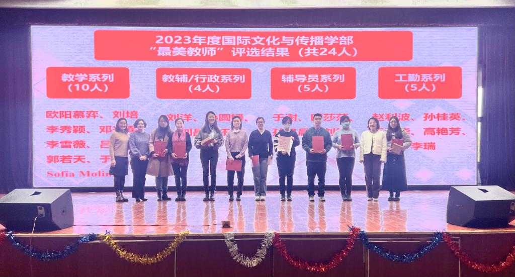 通过班级推荐,学生代表打分,最终选出教学系列“最美教师”10人:欧阳慕弈、刘培、李秀颖、邓兴军、李雪薇、吕林婕、郭若天、于睿、李吉、Sofía Molina;通过教师投票选出教辅行政/系列“最美教师”4人:刘洋、孙圆媛、刘晶、于翀;评选出辅导员系列“最美教师”5人:于澍、时莎莎、孙凯晨、刘斌、姜英,工勤系列“最美教师”5人:赵利波、孙桂英、王新华、高艳芳、李瑞。