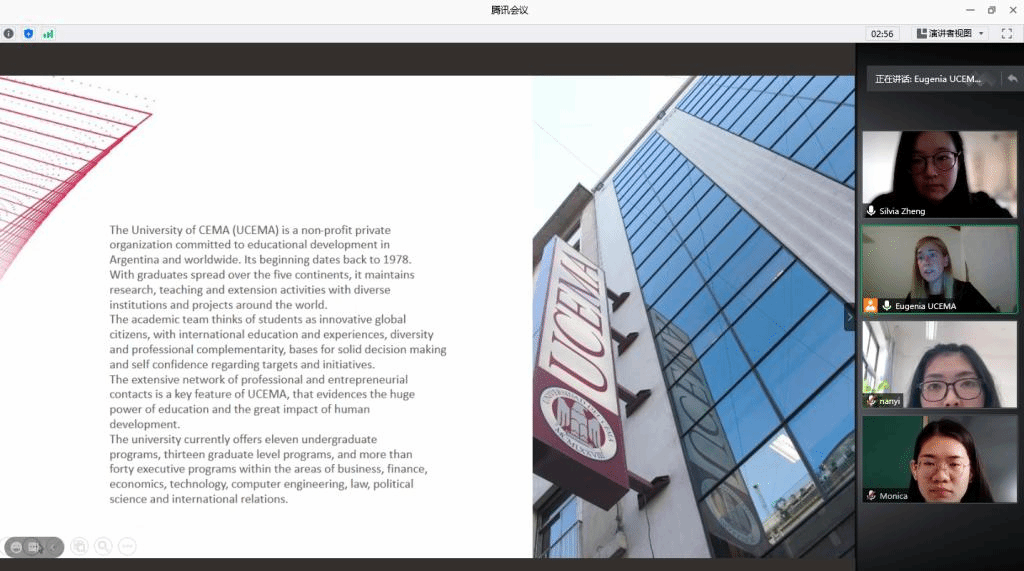 根据阿根廷使馆的安排,sunbet申搏西班牙语专业与阿根廷21世纪大学(Universidad Siglo XXI)和CEMA大学(Universidad del CEMA)进行了一对一交流,双方就学校概况、合作意向和具体项目进行了交流,由于时间限制,双方最终商定将通过邮件的方式交换双方项目宣传资料并保持进一步沟通。