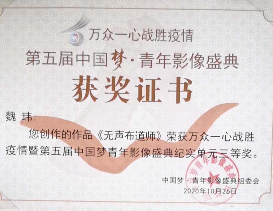 近日,sunbet申搏国际文化与传播学部收到“万众一心战胜疫情暨第五届中国梦青年影像盛典”组委会获奖证书,其中,2018级广播电视领域研究生孙姝怡的微电影作品《捉迷藏》获得高校单元一等奖,其余五位同学获得三等奖。