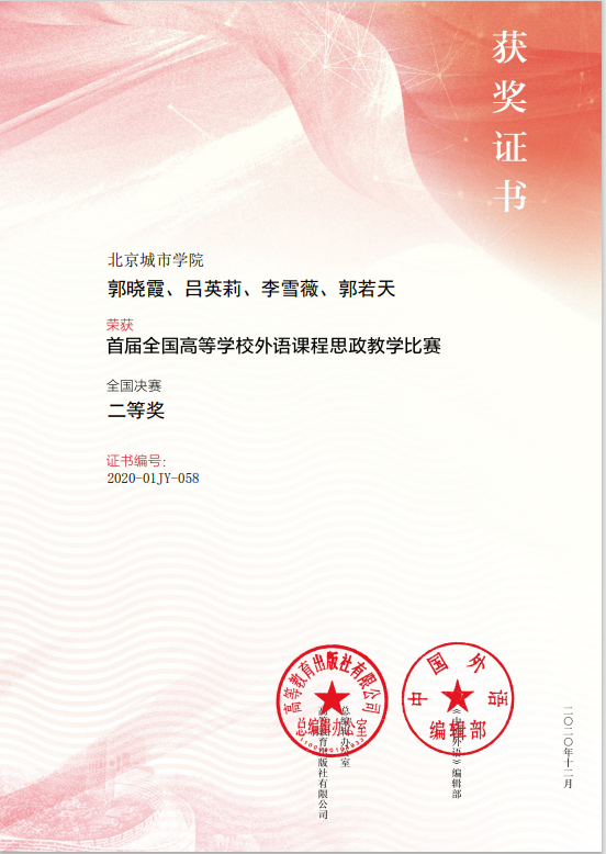 12月,英语教研室教师在两项高水平的教学及教科研评比中斩获佳绩。其中,赵靖娜老师所撰写的The Effect of Cognitive Task Complexity on EFL Writing一文在“2020年全国高等院校英语教学优秀学术论文评选”中荣获二等奖。郭晓霞老师所带领的教学团队在高等教育出版社与《中国外语》编辑部共同举办的“首届全国高等学校外语课程思政教学比赛”中获得全国决赛二等奖。