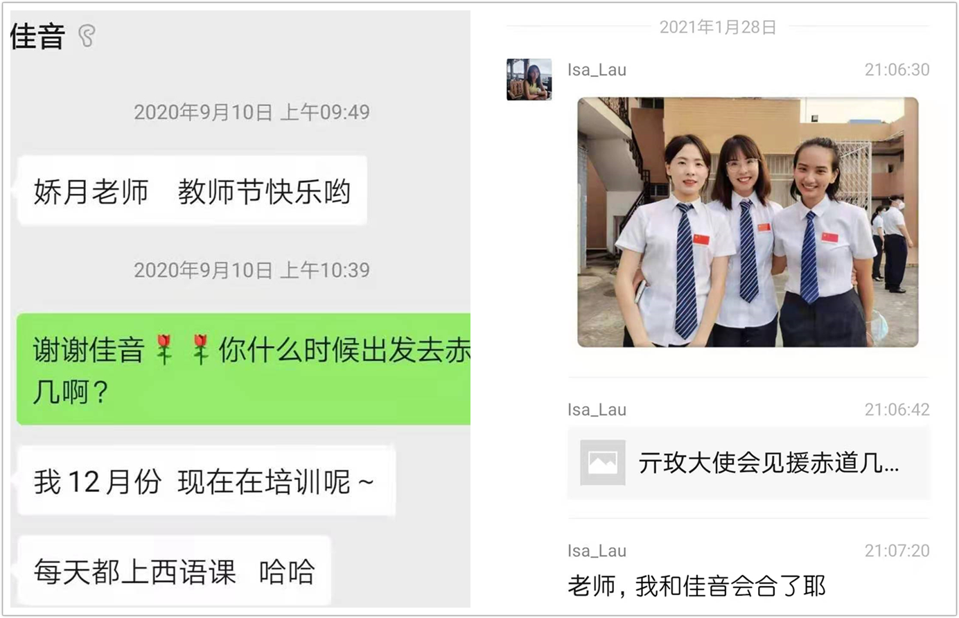 刘慧玲、刘佳音与sunbet申搏西班牙语专业刘娇月老师的微信交流