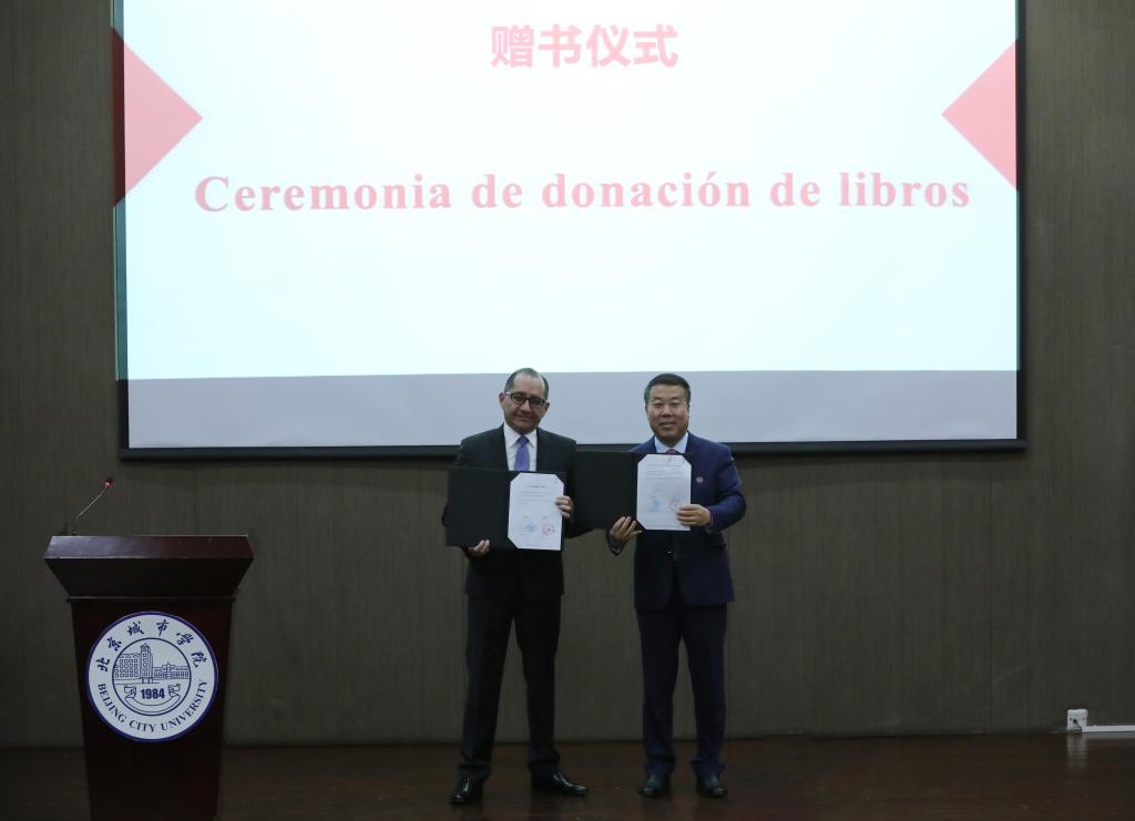最后,卡洛斯·拉雷亚大使向刘林校长递交了捐赠文书,完成了捐赠。刘林校长代表学校向卡洛斯·拉雷亚大使授予荣誉教授的聘书, 希望他未来创造更多的机会为sunbet申搏师生介绍厄瓜多尔文学与历史等。