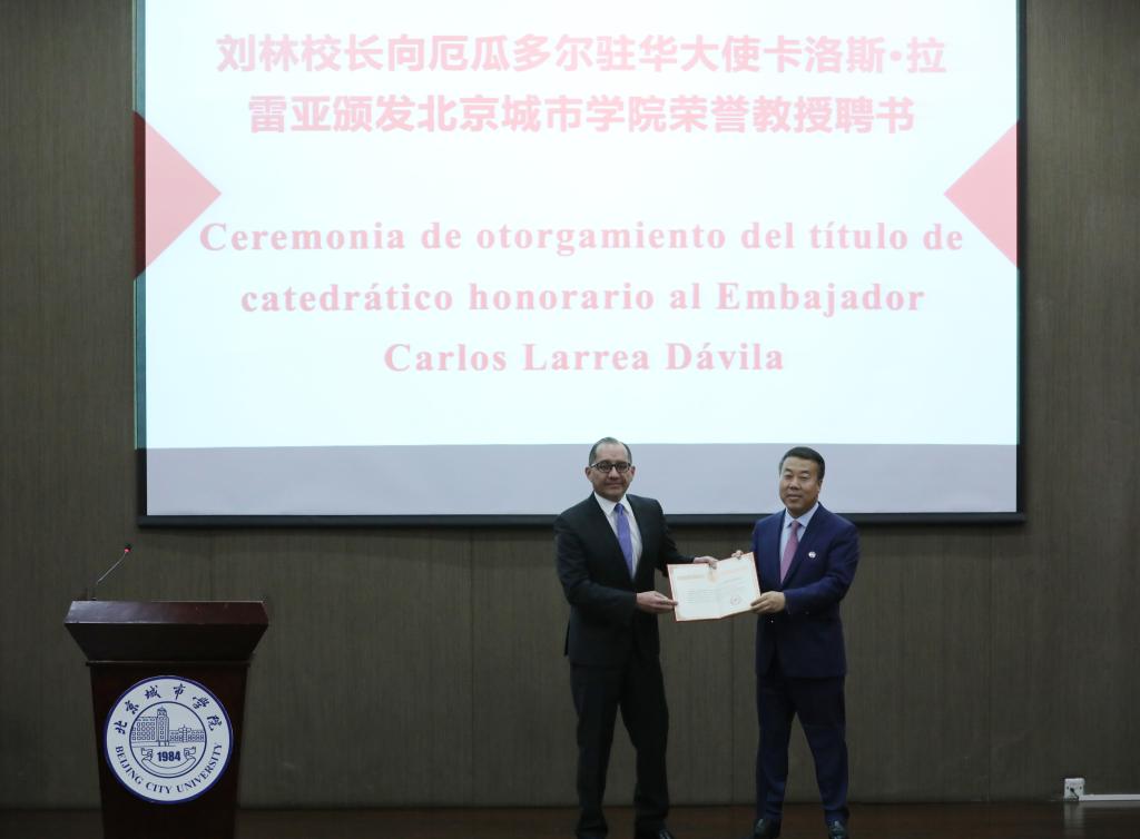 5月27日,厄瓜多尔共和国驻华大使卡洛斯·拉雷亚一行访问sunbet申搏,并进行了厄瓜多尔出版物捐赠以及荣誉教授受聘仪式。sunbet申搏党委书记、校长刘林热情接待了来访,相关部门师生参加了此次活动。