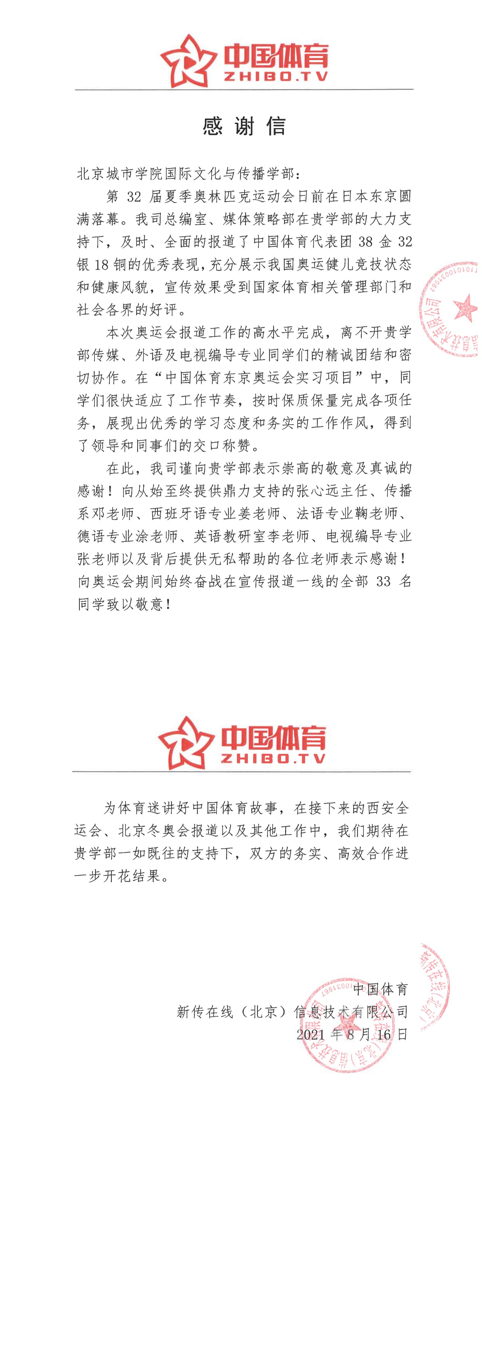 近日,国家体育总局中国体育报业总社「中国体育」向sunbet申搏国际文化与传播学部发来感谢信,表扬学部传媒类各专业(包括传播学、广播电视编导本、硕)以及外语类各专业(包括英语、法语、西班牙语、德语、翻译)共计33名同学出色完成7月15日至8月10日“中国体育东京奥运会综合报道实习”活动,同学们优秀的实习表现得到了国家体育相关管理部门和社会各界的好评。