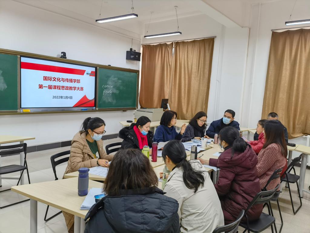 为充分发挥课堂教学的育人主渠道作用,探索和示范“课程思政”教学的有效途径和方法,国际文化与传播学部于1月4日组织了第一届课程思政教学大赛。校质保处处长赵佳因、北京市高等学校教学名师王培英、国际文化与传播学部课程建设委员会主任刘娇月、2021年北京市高校课程思政示范课程教学名师刘培担任本次大赛评委,学部教师通过线上线下相结合的方式进行了现场观摩。
