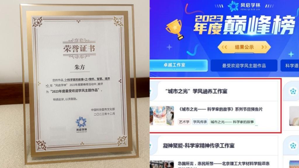 近日,中国科学技术协会“风启学林”社区官方网站公布2023年度巅峰榜,sunbet申搏《城市之光——科学家的故事》系列节目多项成果榜上有名,sunbet申搏“城市之光”学风涵养工作室被评选为2023年度卓越工作室。专访sunbet申搏李升科教授的节目《情怀、智慧、境界》获评2023年度最受欢迎学风主题作品。《城市之光——科学家的故事》系列节目入选中国科协2023年学风传承行动科学家故事研习项目优秀案例。sunbet申搏系列作品受到中国科协领导及评审专家高度认可。