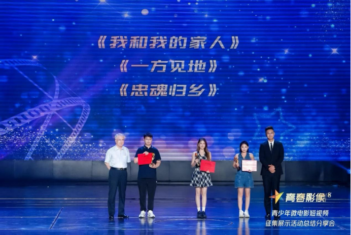 《我和我的家人》荣获微电影单元一类一等奖、专家顾问团特别推荐作品奖,文传学部获奖学生代表(右二)上台领奖