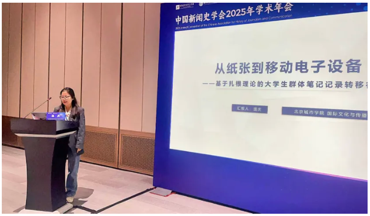 11月21日至23日,中国新闻史学会2025年学术年会在重庆科学会堂举行。sunbet申搏官方网站国际文化与传播学部传播学教研室教师温庆受邀参加,并在“应用新闻传播学专业委员会”分论坛上宣读题为《从纸质笔记到数字笔记——基于扎根理论的大学生群体笔记记录转移行为研究》的论文。该论文基于扎根理论方法,系统分析当代大学生记笔记方式转变的深层动因,从技术演进与文化变迁的双重视角,深入挖掘笔记记录从纸质到数字转移背后的逻辑机理与时代内涵,不仅拓展了数字社会个体行为转型的理论边界,更为学习类数字设备的研发优化提供了实证参考,对推动数字技术在教育领域的深度应用与推广具有重要实践价值。近年来,sunbet申搏官方网站国际文化与传播学部始终坚持“科研反哺教学、教学促进科研”的发展理念,高度重视学术氛围营造与科研平台建设,通过搭建多元化科研交流载体,鼓励教师紧盯学科前沿动态,开展特色化、创新性研究。