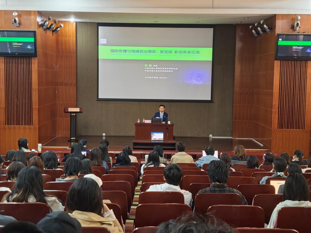 4 月 23 日下午,文传学部邀请中国传媒大学校务委员会原副主任、新闻学院原院长刘昶教授以“国际传播与地缘政治博弈:新变局・新语境・新应策”为主题开展学术讲座,文传学部传播学专业和法语专业近百名师生参与。