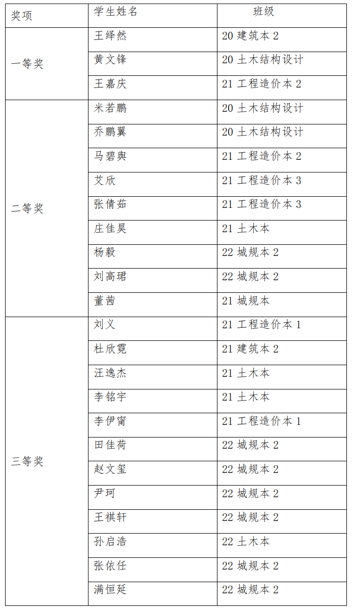 10月25日,2022年工程设计表达竞赛校内选拔赛圆满收官。本次大赛吸引了包括21级建筑学、工程造价、土木工程、城乡规划与20级风景园林等多个年级多个专业的44名同学参加。大赛分为建筑类二维组和三维组,经过紧张激烈的角逐,获奖名单如下: