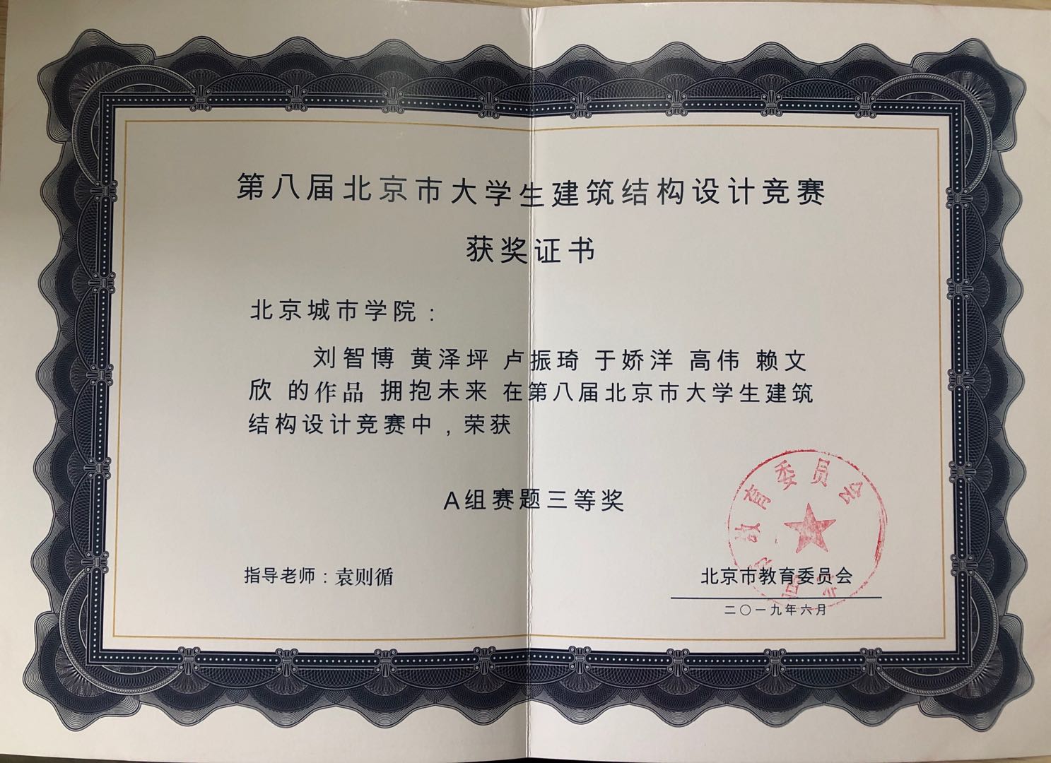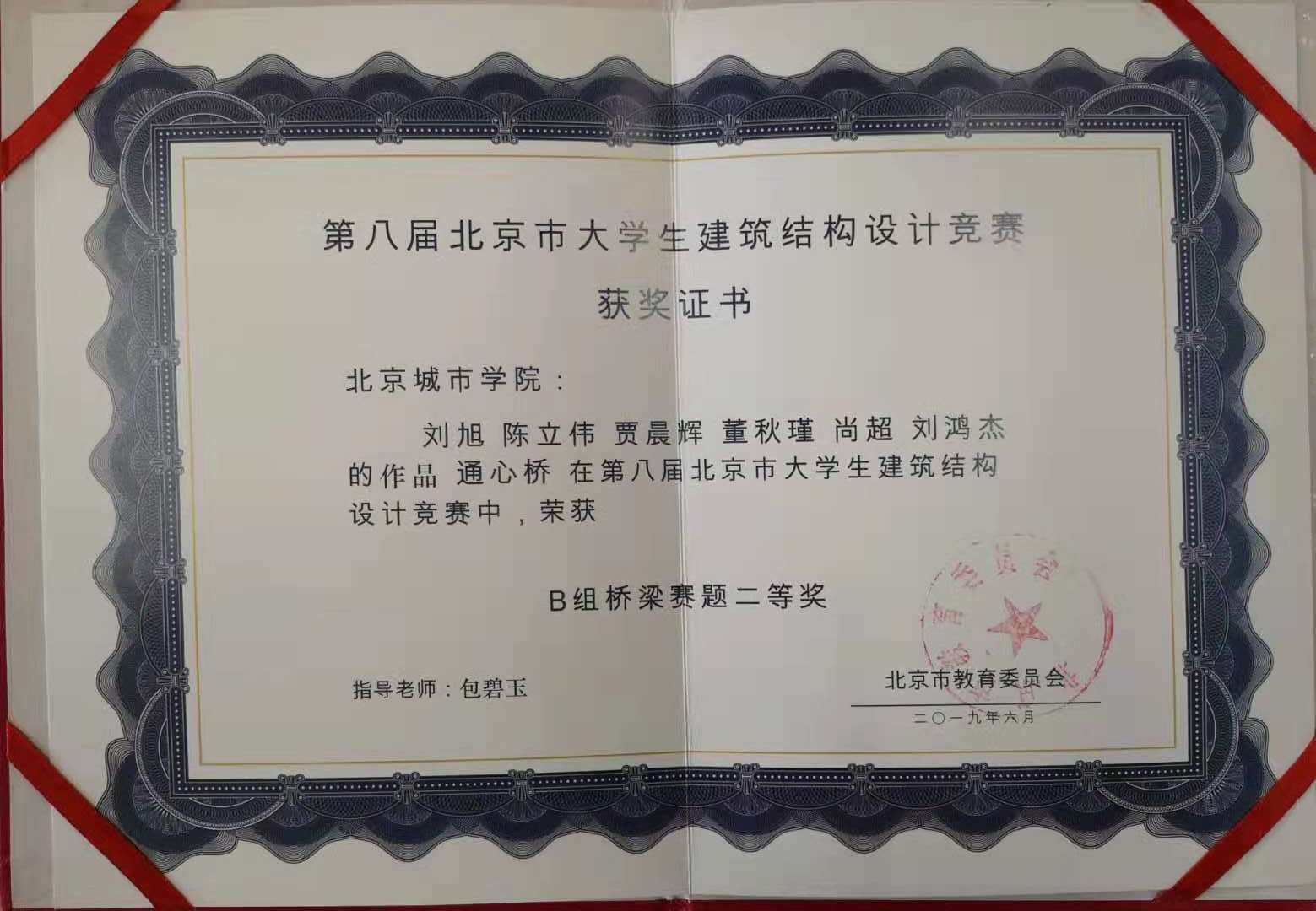 龚港、吴淑涯、华波、刘轩宇、连睿凯、李佳琦,荣获第七届北京市大学生建筑结构设计竞赛B组结构三等奖,指导教师:张翠翠,马静