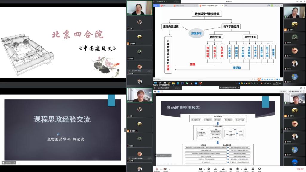 活动中,城市建设学部教师梁飞结合自己参赛获奖的课程《中国建筑史-北京四合院》,从赛制、课程案例、课程汇报三个方面重点进行分享,分析了基于赛制的视频准备、在课程案例中融入历史、文化、气候等元素的课程设计,以及课程汇报环节突出课程内容组织与教学手段应用中学生为主体深度参与的创新点。生物医药学部教师田荣荣以回答“教育的根本问题”为切入点,以《高等学校课程思政建设指导纲要》文件内容为指导,结合已立项的北京市课程思政示范项目《食品检测技术》申报经验,从该核心课程的五大知识模块、三段式混合教学引入,从六个结合点分别分析了优化课程思政内容供给的自我思考。分享结束,老师们对课程创新点如何把握和聚焦等问题积极讨论。